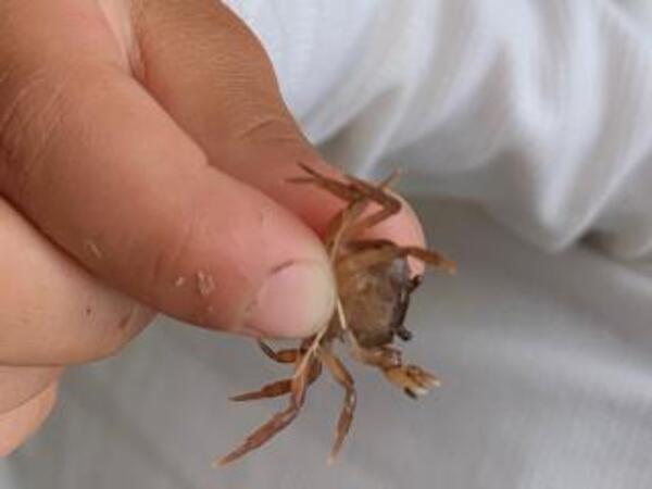 園長先生が捕まえた「さわがに」を触ってみたり、珍しい虫を見つけて喜ぶ子もいました。